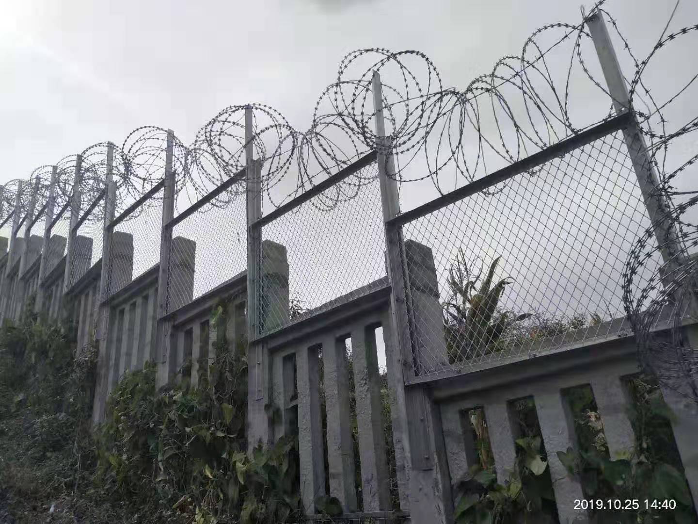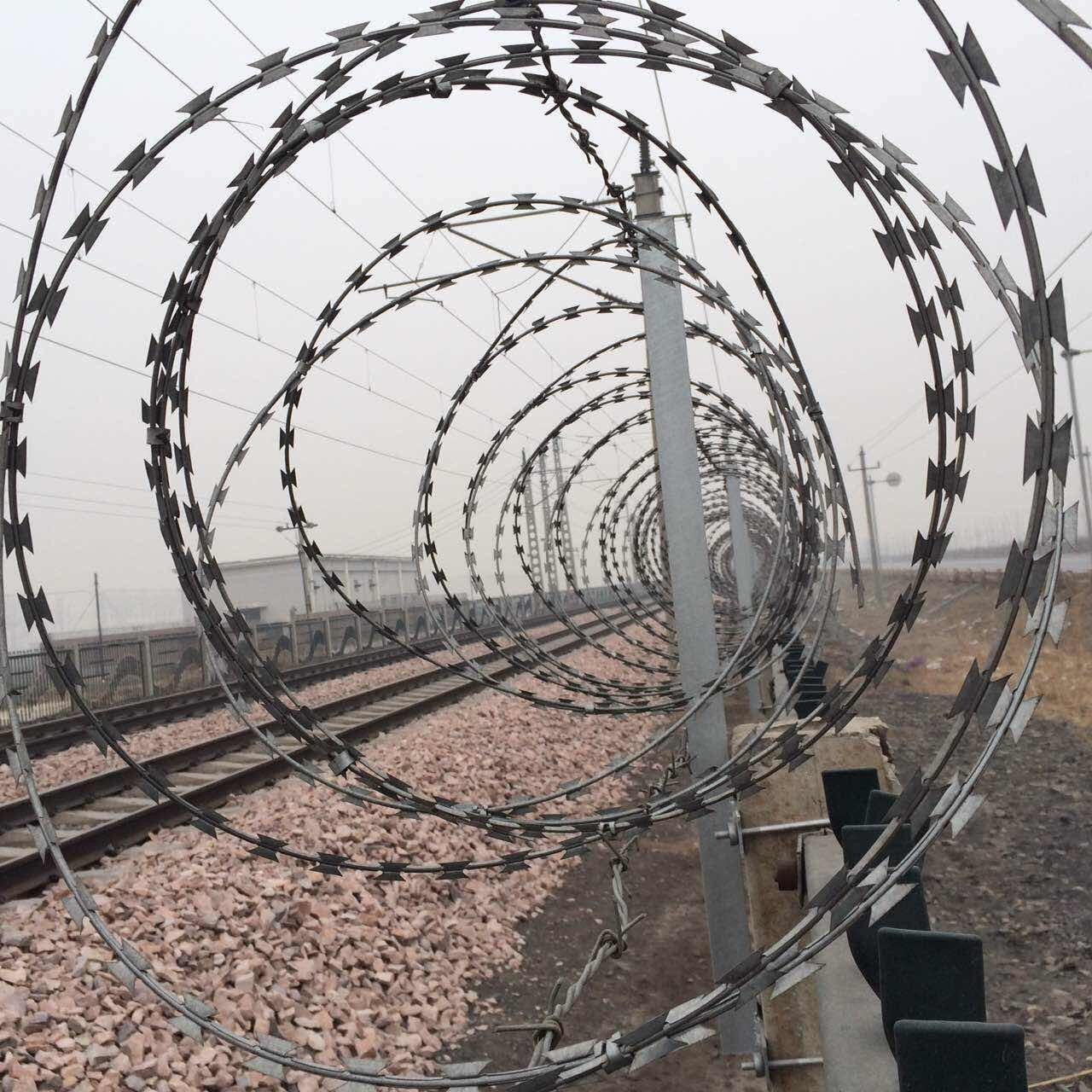 鐵路上面用的刺絲滾籠是直徑500毫米的,拉開間距為20公分,0.5m絲資龍支架和加密支架采用30*50*2.0短形鋼管制作,表面進(jìn)行熱鍍鋅處理,鍍鋅量270g/。縱向拉筋兩道,后安裝刀刺滾籠,通過卡扣連接在縱向拉筋上,從而形成高鐵防護(hù)柵欄加高刺絲滾籠成品。