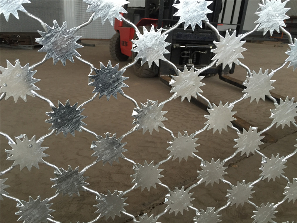 2、多層耐沖擊性:太陽花刺片鋼網的外層鋼筋比內層鋼筋直徑要大,使其具有更好的耐沖擊性和抗振性。同時,內部鋼筋組織結構緊密,網體整體強度高,不易被人為破壞。