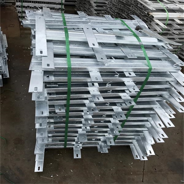 鐵路刺絲滾籠支架為立柱支架采用50*30mm, 壁厚2mm,矩形鋼管和寬50mm厚度4.5mm長度分別為246mm和428mm的兩塊0235扁鐵焊接制作。距形鋼管上部焊接掛鉤采用長度30mm絲徑5mm冷拔鋼筋制作,加密支架采用樣與立柱支架的矩形鋼管制作,表面進行熱鍍鋅處理,鍍鋅量270g/。階梯文架與立柱支架相應采用材料一致,只是高度為1005mm,普通立柱支架為730mm,一般3m間距中間按一處加容支架以增牢堅固性支架與防護柵欄采用支架抱箍連接。