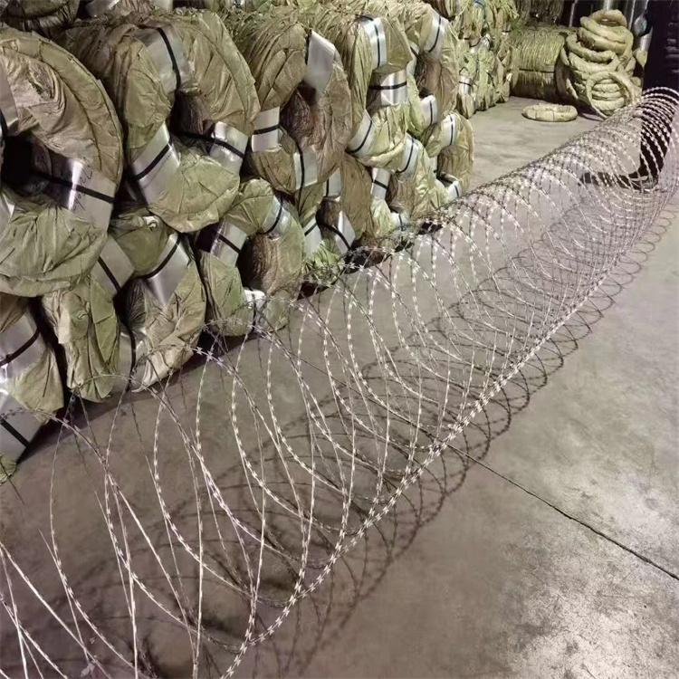 刀片刺網由熱鍍鋅鋼板或不銹鋼薄板沖壓出尖銳的刀片狀,高張力鍍鋅鋼絲或者不銹鋼絲做芯線組合而成的阻絕器材。由于刺網造形 不易觸摸,因而能達到 的防護隔離效果。產品的主要材質有鍍鋅板和不銹鋼板。平時我們常見的,和常使用的就是鍍鋅和不銹鋼當然顏色會比較單一就是呈現銀色,這一款有的時候跟我們的環(huán)境不太搭配,今天給介紹一款還能噴塑對的刀刺繩,呈現出綠色。更能美化環(huán)境。