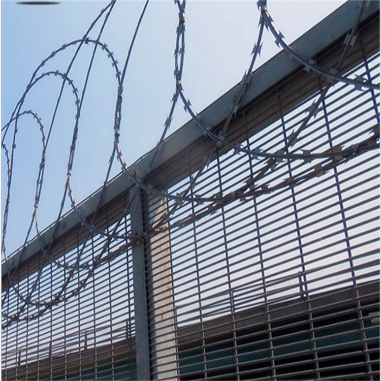 圍墻防爬刺鐵絲網種類1、刀片刺網平網。平面式安裝,三圈交叉固定。優點是節省材料,美觀。