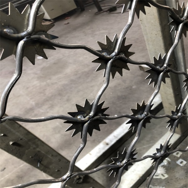 監獄梅花刺阻隔網標準參數梅花刺片:梅花刺片直徑不小于7.0cm(直徑6cm、7cm、8cm),刺片厚1.2mm,選用Q235低碳鋼板沖中壓成型。梅花刺片用氬弧焊將梅花形刺片焊接在美格網的節點上,形成刺形保護,有用的避免了手握腳攀。