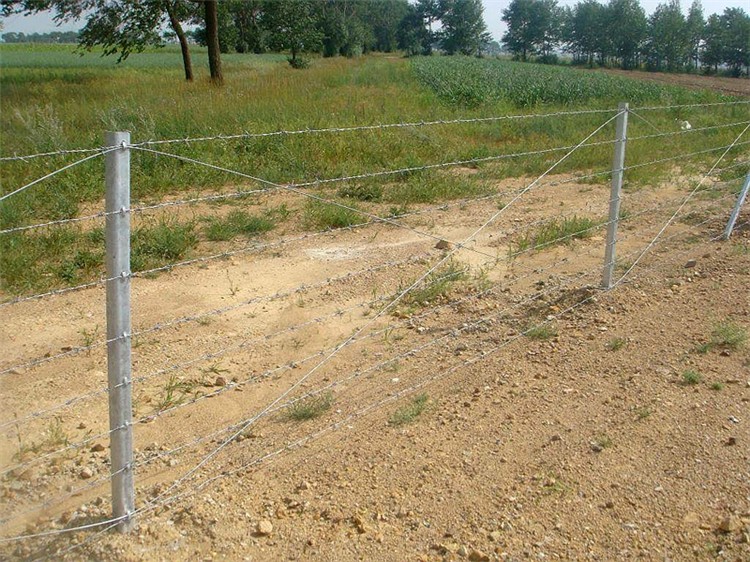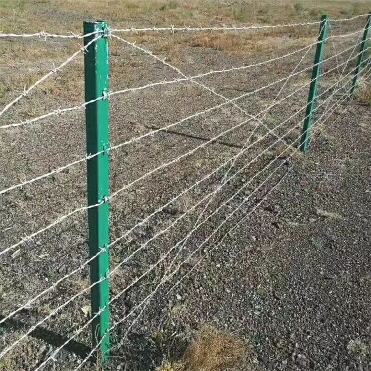 防爬刺絲剌網和立柱搭配使用效果好,每道刺絲刺網之間的間距一般為15- 25公分,高度1.8米,需要9道。農場畜牧業常用的是這種,中間的立柱我們采用方鋼或者是圓鋼使用。支撐立柱焊接固定鉤子,把防扒刺絲剌網固定上面,把勾子拍下去即可。這是常用做法。