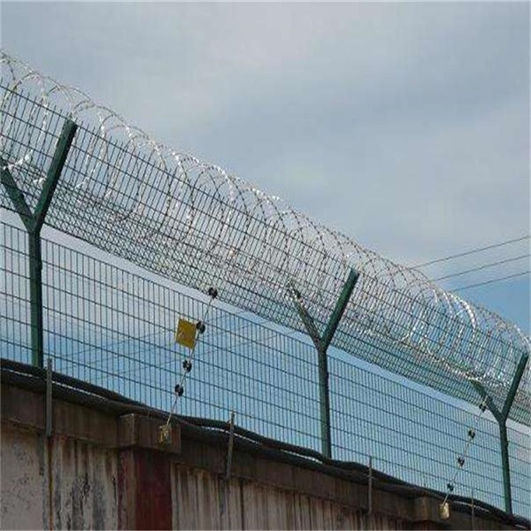 2500mm -3000毫米,頂部安裝V型刀片刺網的高度,用50厘米直徑60厘米,主要由熱浸鍍鋅鋼板或不銹鋼薄板金屬形成的剃刀線,它有鋒利的刀片,高強度鍍鋅鋼絲或不銹鋼絲相結合的產物。由于刺網的形狀很特別,每個點都有一個刀片狀的提示,從而可以實現出色的防守保護作用   監獄隔離網墻的優點    1.產品美觀,實用,方便運輸和安裝的特點