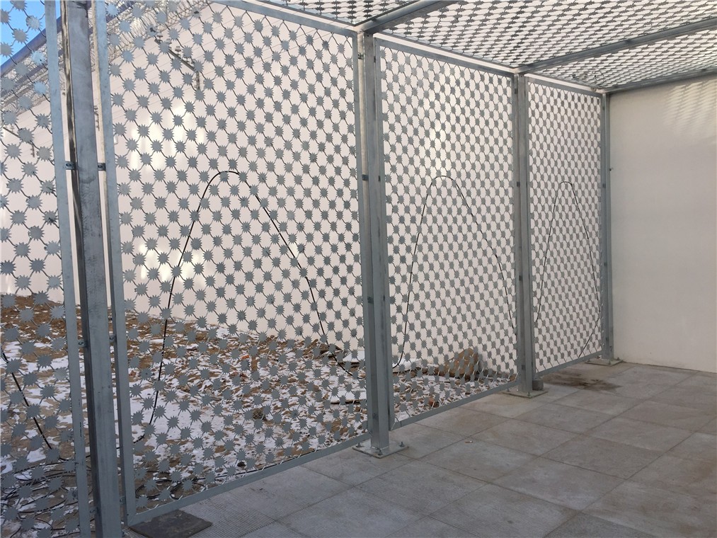 監(jiān)獄梅花刺網(wǎng)又稱監(jiān)獄護(hù)欄網(wǎng)或監(jiān)獄隔離網(wǎng),主要是用刀片刺網(wǎng)與普通防護(hù)網(wǎng)的結(jié)合,由V型支架立柱,加強(qiáng)型焊接片網(wǎng),安全防盜連接件和刀片刺網(wǎng)組成刀片刺網(wǎng)是一種新型防護(hù)網(wǎng),由銳利尖角鍍鋅鋼板或不銹鋼薄板做刀片,鋼絲做芯線組合而成的防護(hù)器材。因?yàn)槊坊ù叹W(wǎng)的網(wǎng)孔是由一個(gè)個(gè)梅花刺組成的,而梅花刺形狀酷似太陽花,因此,梅花刺網(wǎng)在有的地方也叫太陽花隔離網(wǎng)。