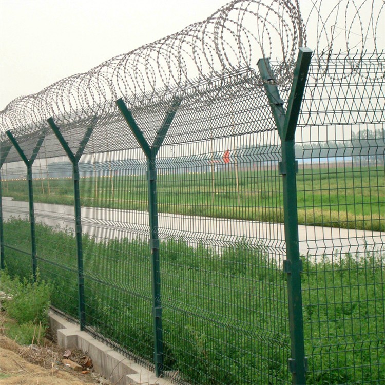 機(jī)場(chǎng)護(hù)欄網(wǎng)又稱作“Y型安全防御護(hù)網(wǎng)”,是由V型支架立柱加強(qiáng)型焊接片網(wǎng),安全防盜連接件和熱鍍鋅刀片刺網(wǎng)組成強(qiáng)度和安全防御性級(jí)別很高。被廣泛應(yīng)用在機(jī)場(chǎng),基地等高安全場(chǎng)所。