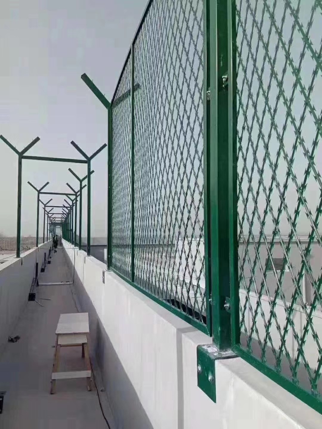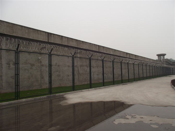 監獄鋼網墻一般頂端都設有V型支架與立柱焊接。材料通常選擇和立柱同等材料或者稍小規格材料搭配使用。V型支架的加裝是為了將蛇腹形刀刺網固定在鋼網墻頂部,從而有效的增加監獄鋼網墻的防攀爬性和安全性。V型支架加裝防拆卸刀刺網。刀刺網的直徑一般為500mm、600mm、800mm,材質均為優質304不銹鋼,鎳含量8個以上。刺網芯線直徑為2.5mm、刀片長22mm,刀片寬度15mm,刀片厚度0.5mm。 蛇腹形刀刺網的排列密度不小于16圈/米,相鄰每圈間距不大于120mm 。監獄用的刀刺網通常卡扣之間的距離是120mm,直徑500mm的刀刺網 ,覆蓋一米的重量約為2.38公斤(其他直徑的覆蓋長度可以詳細詢問安平縣艾瑞金屬絲網有限公司業務部,向您詳細解答)。監獄鋼網墻表面處理常分為熱浸鋅、浸塑、噴塑三種防腐處理。做完這些才能保證安全和基本10年左右的防腐。