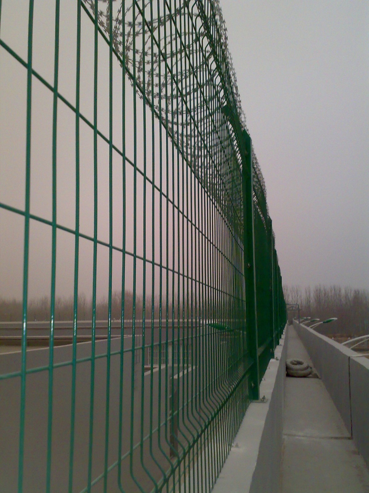 看守所警戒隔離網墻通常采用鋼絲直徑為5mm、6mm、6.5mm,網孔采用50mm×100mm、50mm×50mm、50mm×200mm、50mm×150mm,組成結構:首先把網片焊接在鐵管框架上,框架是方管或者圓管焊接成的框架結構,在框架上焊接用于個立柱連接的連接板,用防盜螺栓與立柱連接。為了保證網片的防拆卸性能,網片連接方式采用特制防盜緊扣件,有效防止人為的破壞性拆卸。