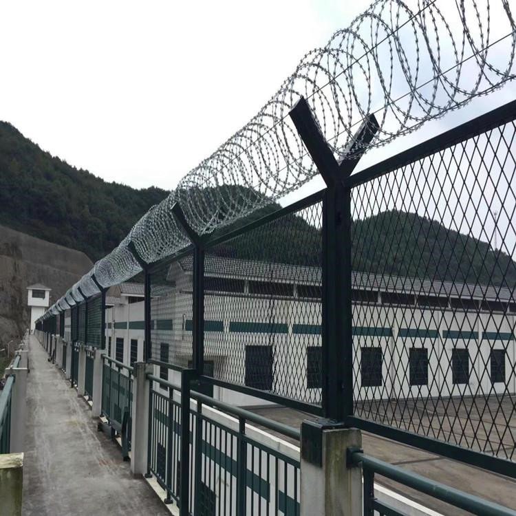 國內監(jiān)獄、看守所等所采用的巡邏道隔離網一般為鐵絲焊接而成,上邊講到的就是鐵絲焊接型,但是也有些設計要求是焊接刀刺網樣式的。