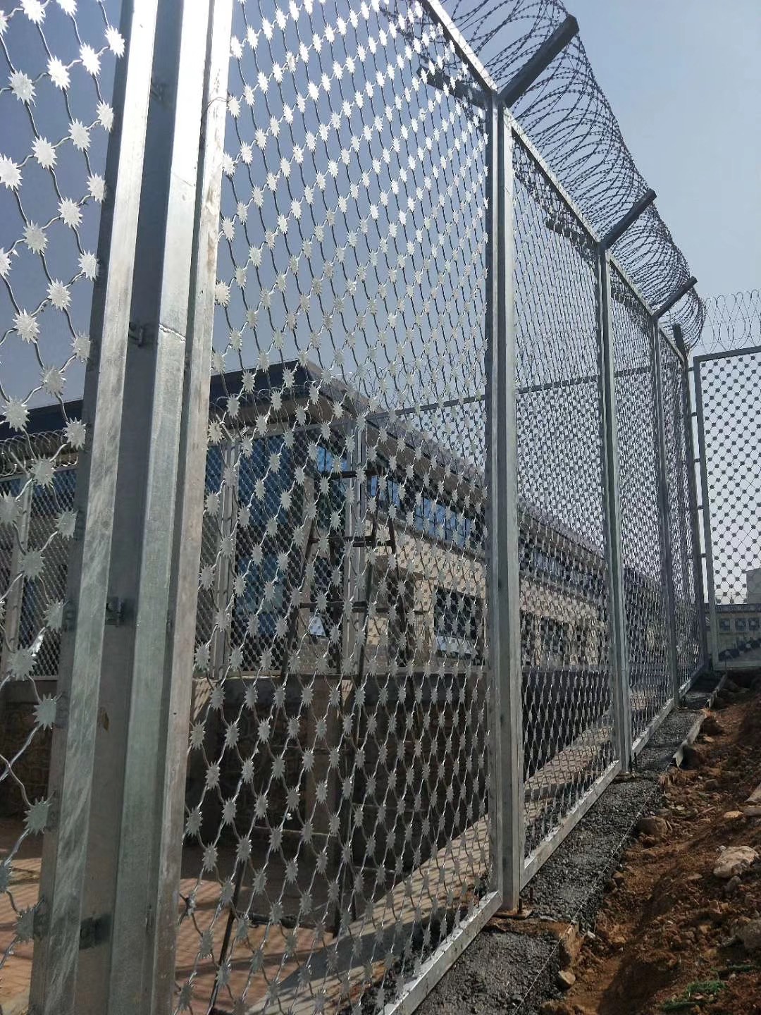 3、刀片刺網隔離網,網片是以交叉型刀刺網組成的菱形網孔框架網,防攀爬效果更好,刀型鋒利,美觀實用;