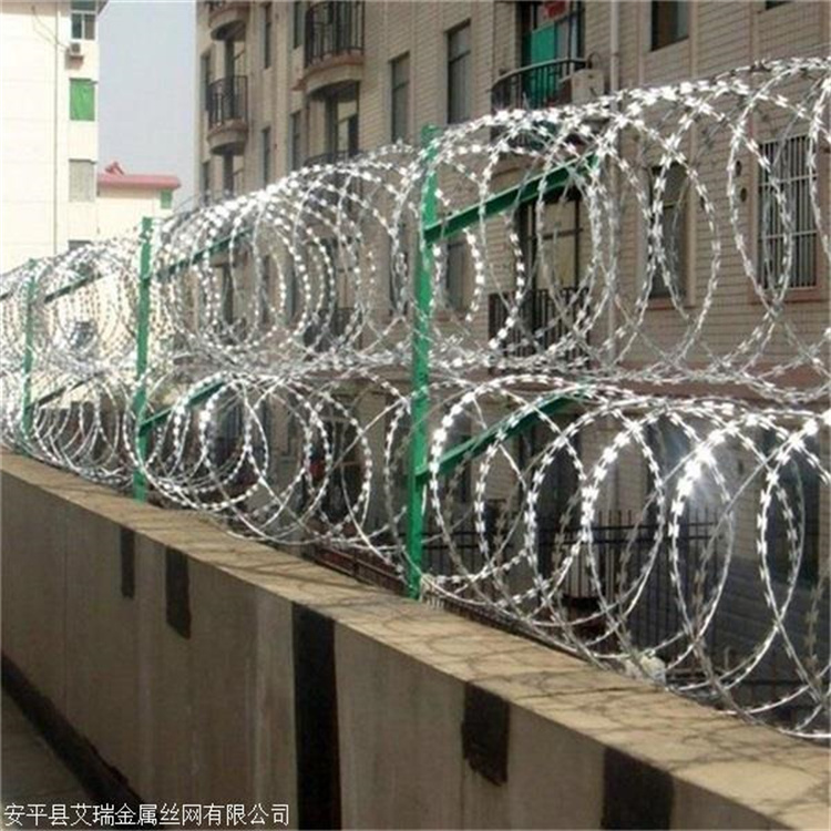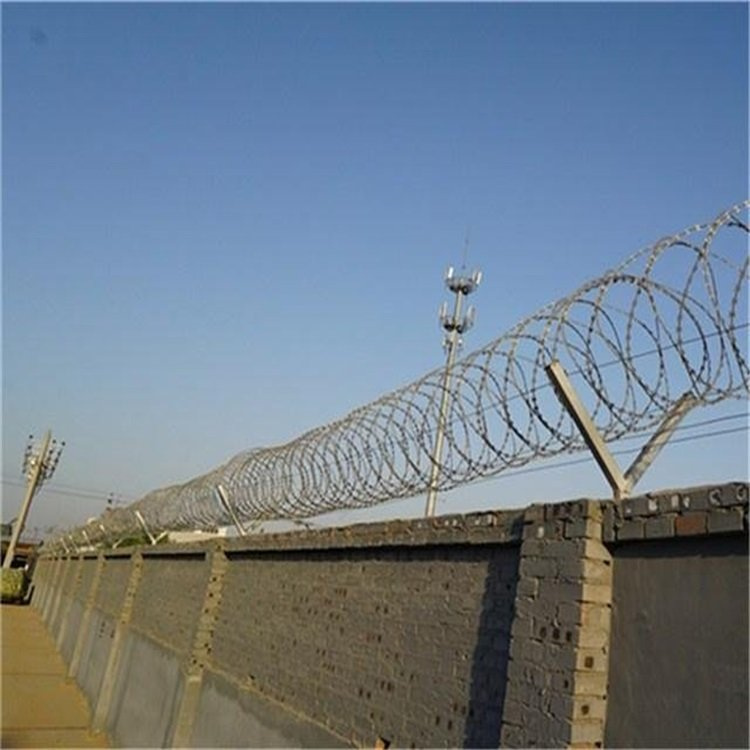 3、圍墻上刺絲滾籠與之相鄰兩圈每隔120度用刺絲連接卡固定張開后形成蛇腹網狀,閉合后機場刀刺網卷徑為500mm,張開后每交又圈安裝間距20cm,直徑不小于450mm。