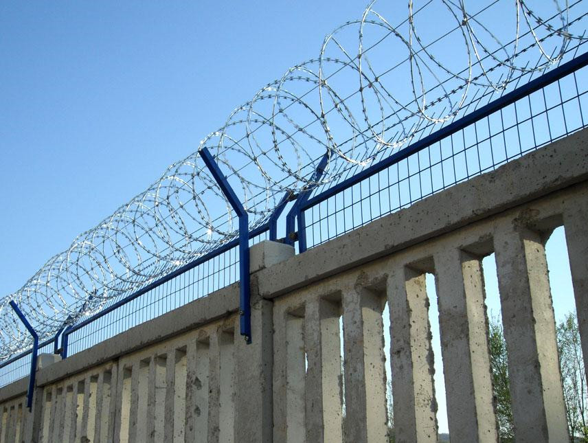 鐵路刺絲設(shè)置規(guī)范:鐵路刺絲滾籠采用刀片刺繩繞圈后相臨兩圈每隔120mm用刺絲連接卡固定,張開(kāi)后形成蛇腹網(wǎng)狀,閉合后刀片刺繩圈徑為500mm,張開(kāi)后每交叉圈安裝間距200mm,直徑不小于450mm。鐵路刺絲滾籠由刺絲連接卡扣與固定在支架上的縱向拉筋相連接,縱向拉筋與支架的連接采用02.5mm的冷拔鍍鋅鋼絲繞2圈后寧緊固定,支架設(shè)置在跨度3m防護(hù)博欄的立樣和跨中位置,其他跨度僅設(shè)置與立樣上部,支架與防護(hù)機(jī)爛采用支架拘籍連接。鐵路刺絲滾籠刀片刺繩由沖切鋼板采用機(jī)械壓軋?jiān)阡摻z上成型,刀刺寬度22mm,兩刃垂直間距15mm,刀刺縱向間距34m.芯絲直徑為2.5mm。刀片采用厚度0.5mm的Q195鋼板沖切制作,芯絲由HPB30006.5mm高線鋼絲加工.